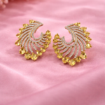 A striking blend of artistry and elegance The Golden Aura Earrings showcase a graceful fan design embellished with shimmering stones that catch the light from every angle Perfect for making a bold yet sophisticated statement